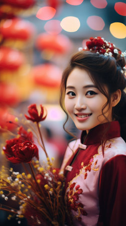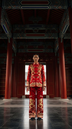 A vertical tall (9:16) full body shot of a woman celebrating Lunar New Year, standing elegantly in a