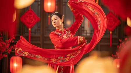 Asian dancer in red traditional dress with flowing scarf, red lanterns, festive