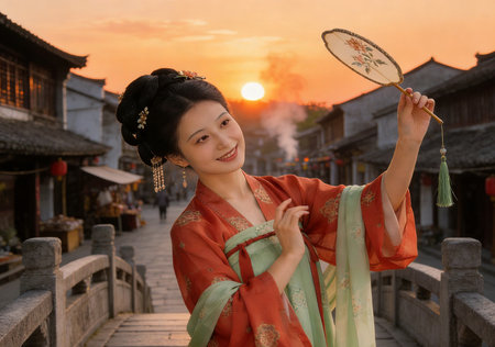 Beautiful asian woman wearing traditional chinese kimono and holding fan