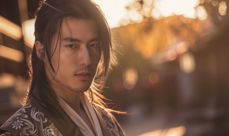 Portrait of young Asian man with dark long hair in traditional clothes looking at camera