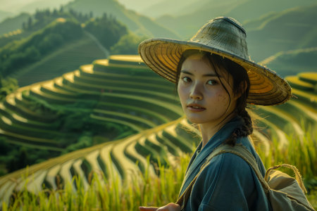 Young Asian Woman in Traditional Hat Standing Before Picturesque Rice Terraces at Sunset AI Generative