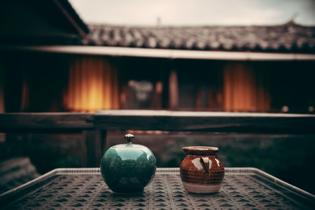Old Naxi style courtyard and tea pot in Lijiang, Yunnan, China.