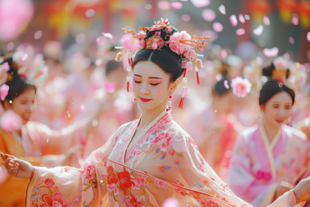Traditional costumes, cultural festival, vibrant colors, heritage celebration, Asian cultural attire, ornate decorations, face paint, historical significance in a festive setting