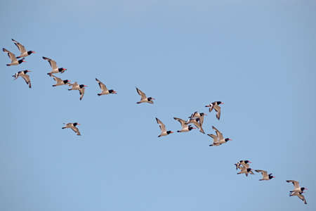 Flying flock of Eurasian oystercatchers Haematopus ostralegus aka the common pied oystercatcher, or palaearctic oystercatcher. Northam Burrows, Devon.