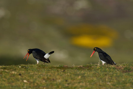 Magellanic Oystercatchers (Haematopus leucopodus) displaying on grassland on Carcass Island on the Falkland Islands.