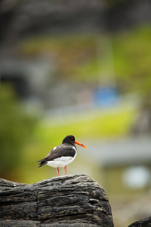 A closeup shot of a Eurasian Oystercatcher bird standing on a rock in Runde Island in Norway,