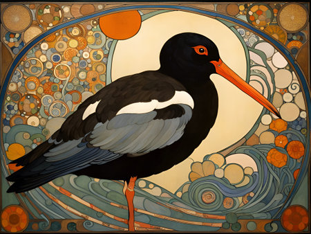 Decorative art nouveau illustration of an oystercatcher in an ornate decorative golden background