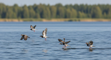 Wild birds wade in the pristine lake, showing the beauty of nature and the diversity of wildlife in ornithology.