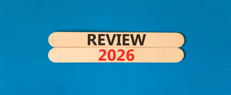 Review 2026 symbol. Concept words Review 2026 on beautiful wooden sticks. Beautiful blue paper background. Business and review 2026 concept. Copy space.