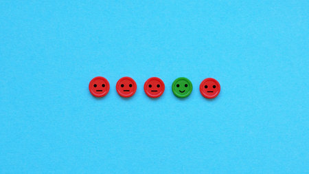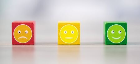 Colorful wooden blocks with emotion face. Customer evaluation and satisfaction concept.
