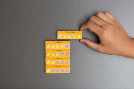 Hand holding wooden block at the five-star symbol gives satisfaction in service.
