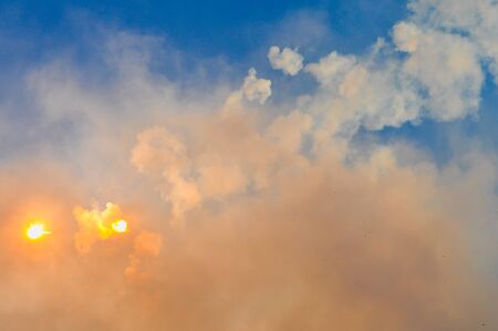 Bright yellow light on red dim cloudy in dramatic hot sky
