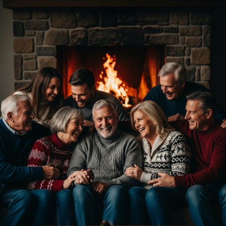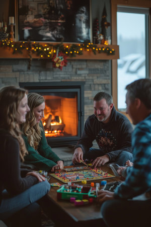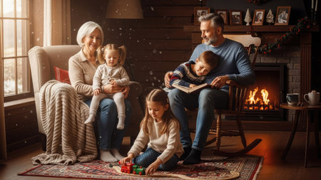 A multigenerational family is gathered indoors, engaged in activities. The scene is illuminated by warm lighting, showcasing a fireplace and cozy atmosphere. The composition includes diverse individuals in a setting that suggests leisure. Suitable for editorial and commercial applications.