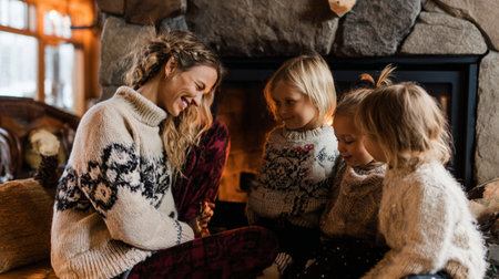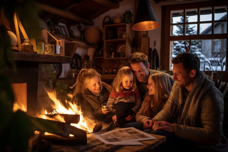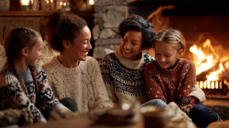 Cozy family gathering by the fireplace in a rustic cabin during winter, sharing smiles and warmth together. Generative AI