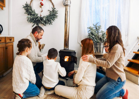 Family enjoying a cozy evening together by the warm fireplace in their living room during winter