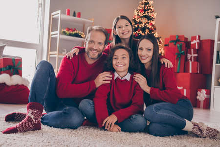 Full size photo of dream family cuddle sit together on carpet wear red sweaters jeans socks x-mas indoors