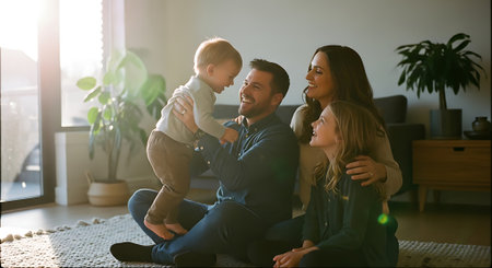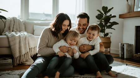 A family of four enjoys quality time together on the living room floor, laughing and playing with each other in a bright and cozy home environment.