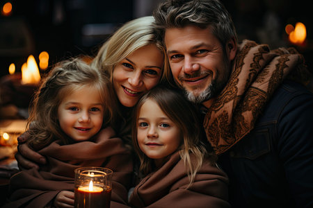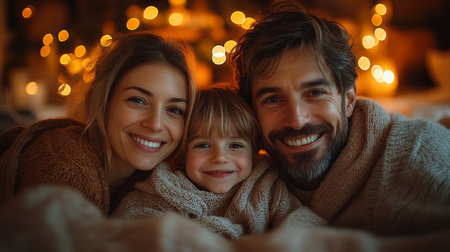 A cozy family moment by the warm glow of lights during winter, with parents and their child snuggling under soft blankets. Generative AI