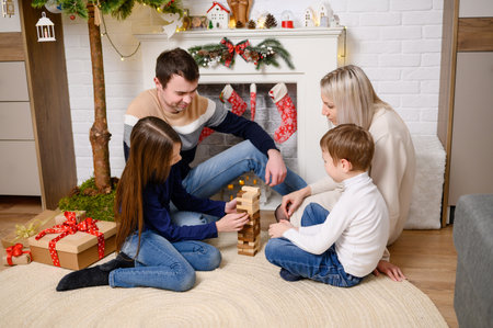 Happy family plays board game at home. Mom, dad, daughter, and son sit on floor near fireplace and decorated tree, spending free Christmas time together in living room. Family activities at home