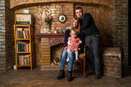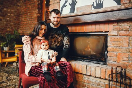 Happy family sitting in front of fireplace at home. Winter holidays concept.