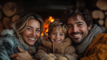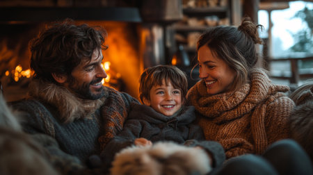 A cozy family portrait by the fireplace during winter, capturing joy and warmth in a rustic cabin setting. Generative AI