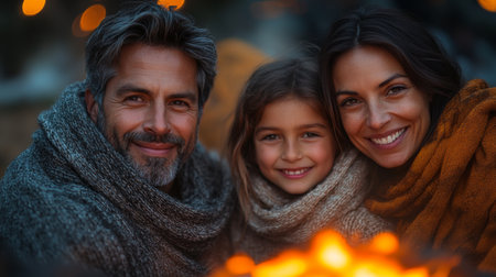 A family gathers around a warm fire during a cozy evening in the woods, wrapped in blankets with joyful smiles and love. Generative AI