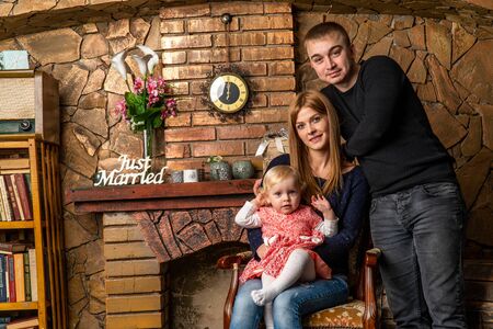 Happy young father, mother and daughter sit on wicker sofa at home. The image of a happy family expecting the second child, studio