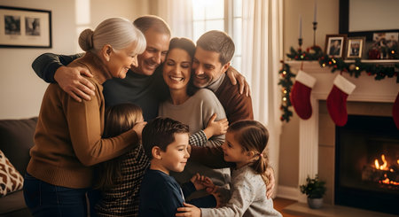 A large, multi-generational family shares a warm group hug in a cozy living room decorated for Christmas. Grandparents, parents, and children smile together, celebrating holiday togetherness and love.