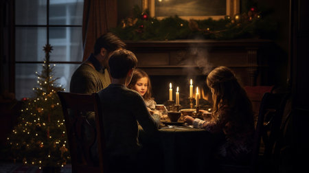 United Family Watches movie next to the fireplace on cold Christmas Eve., generative AI