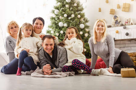 Big family dressed in cozy sweaters sitting near the fireplace in the house in the mountains durnig winter time together. holiday and travel concept