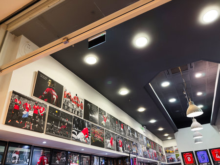 Stretford, UK - November 15, 2025: Visitors explore a Manchester gallery filled with football memorabilia, framed photos, and red jerseys.