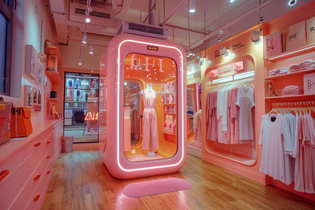 Modern Pink Retail Store Interior With Mannequin Displaying Clothing and a Photo Booth