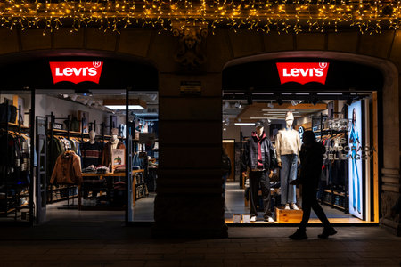 Barcelona, Spain - November 25, 2025: Sign of a Levis clothing store at night with people around in a shopping street in Barcelona, Catalonia, Spain