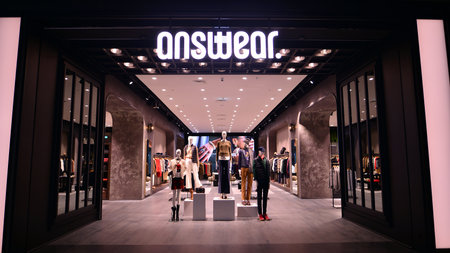 Warsaw, Poland. 21 November 2024. The interior of the Fabryka Norblina shopping center. Answear store and logo of one of the biggest online shop.