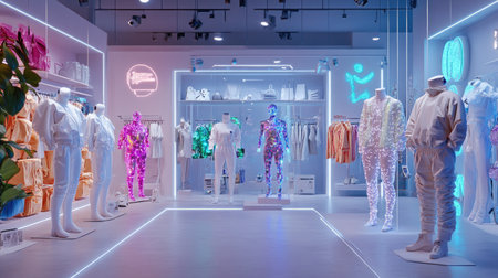 Explore a contemporary retail store featuring innovative displays and vibrant clothing. The space combines modern design with colorful neon elements to enhance the shopping experience.