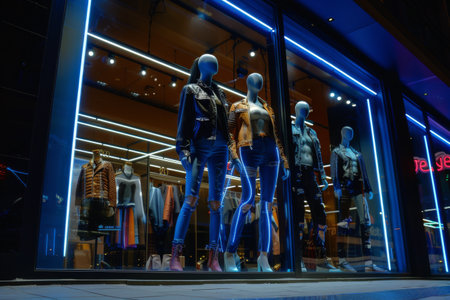 Mannequins adorned in fashionable attire stand in a beautifully lit retail display, attracting passersby with their modern styles under neon lights in an urban setting.
