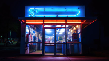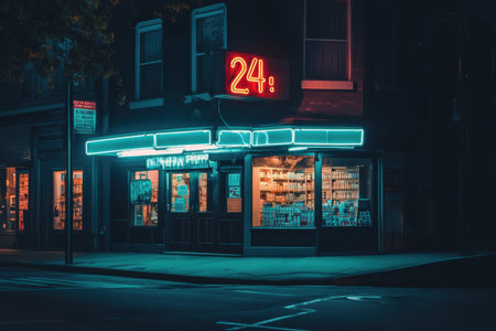 A vibrant convenience store bathed in blue neon light stands open 24 hours. The shop displays a variety of products behind its large windows, inviting customers in during the nighttime.