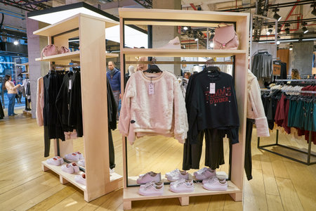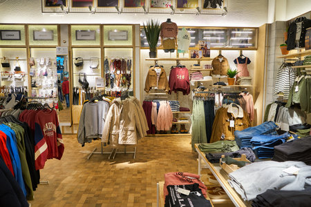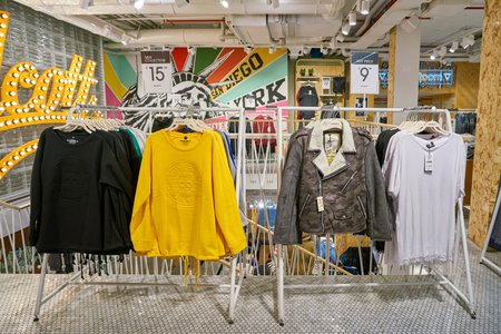 MOSCOW, RUSSIA - SEPTEMBER 14, 2019: interior shot of a Pull&Bear store at Salaris shopping mall in Moscow. Pull&Bear is a Spanish clothing and accessories retailer.