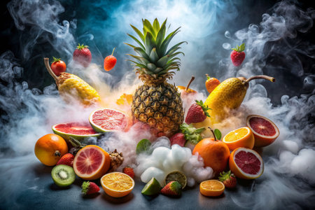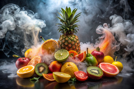 A creative composition featuring a colorful fruit arrangement surrounded by vibrant and whimsical smoke effects for a dynamic look.