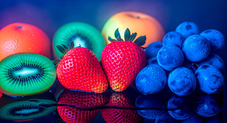 Colorful display of assorted fresh fruits featuring strawberries, blueberries, kiwi, oranges, and grapes on a shiny surface, highlighting their freshness and vibrant hues