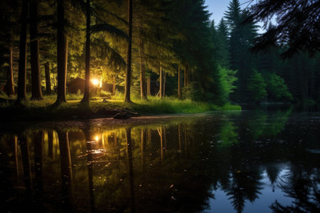 firefly lit fishing spot beside a still lake in the woods, created with generative ai