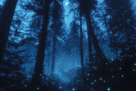 Serene forest scene at night, bathed in a mystical blue light. The path is illuminated by many small glowing lights, creating a magical and enchanting atmosphere. Tall trees form a canopy above, and a soft mist hangs in the air.
