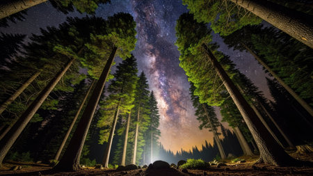 Milky Way over Pine Tree Forest, Yosemite National Park, California, USA