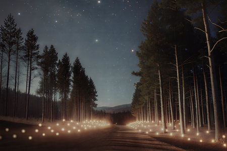 A magical road winds through a forest at night, illuminated by soft lights under a starry sky.
