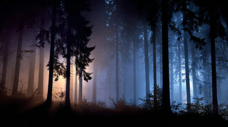 Silhouetted pine trees stand in a misty forest bathed in an eerie blue moonlight, creating a mysterious and atmospheric night scene.
