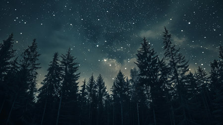 Tall evergreen trees create dramatic silhouettes against a misty night sky filled with stars. The serene forest atmosphere evokes tranquility and wonder.