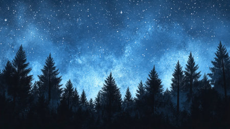 Stars twinkle bright in a clear night sky, casting a serene glow over tall trees. The silhouettes create a peaceful atmosphere in a secluded forest landscape.