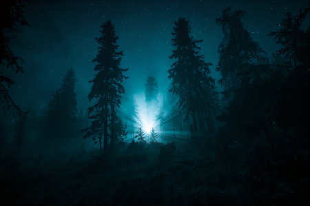 Mysterious Dark Forest with Night Time Fog. Spruce Tree in Front and Strange Light From Background