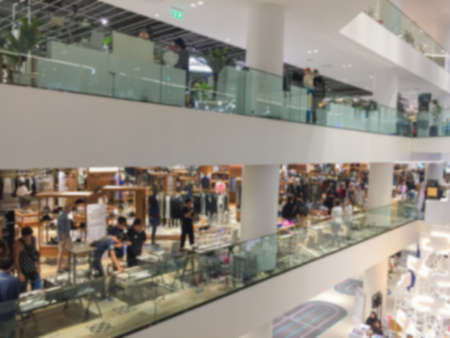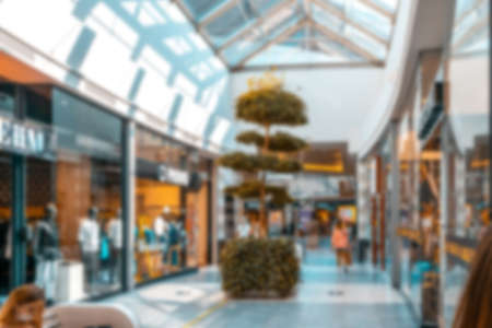 Bokeh Shopping mall background. Interior of retail center store in soft focus. People shopping in modern commercial mall center. Fashion market hall