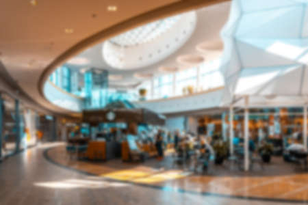 Shopping mall building blurred background. People shopping in modern commercial mall center. Interior of retail center store in soft focus. Luxury inside business hall